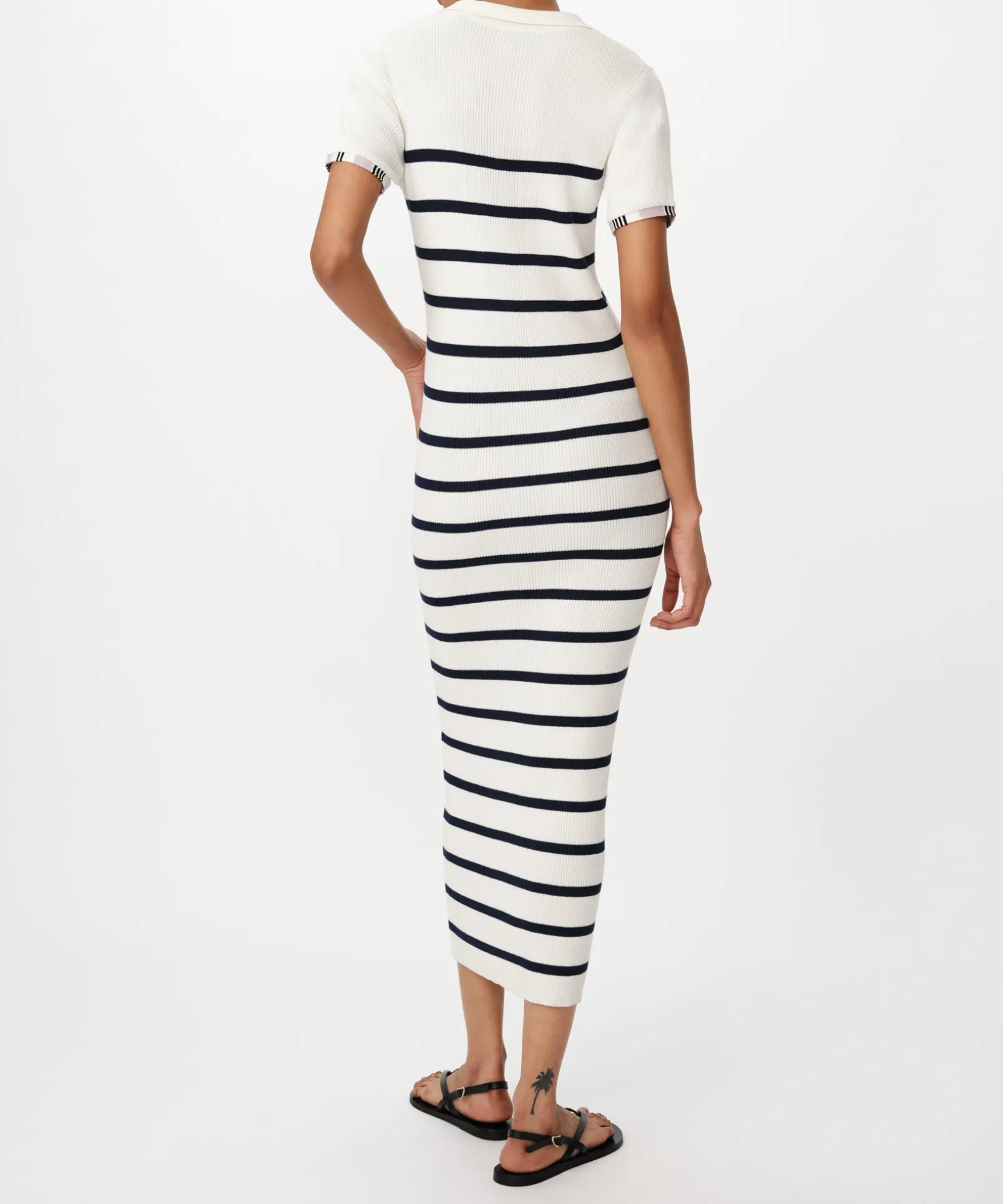 Cotton Silk Blend Striped Sleeveless Split Collar Dress – White-Midnight