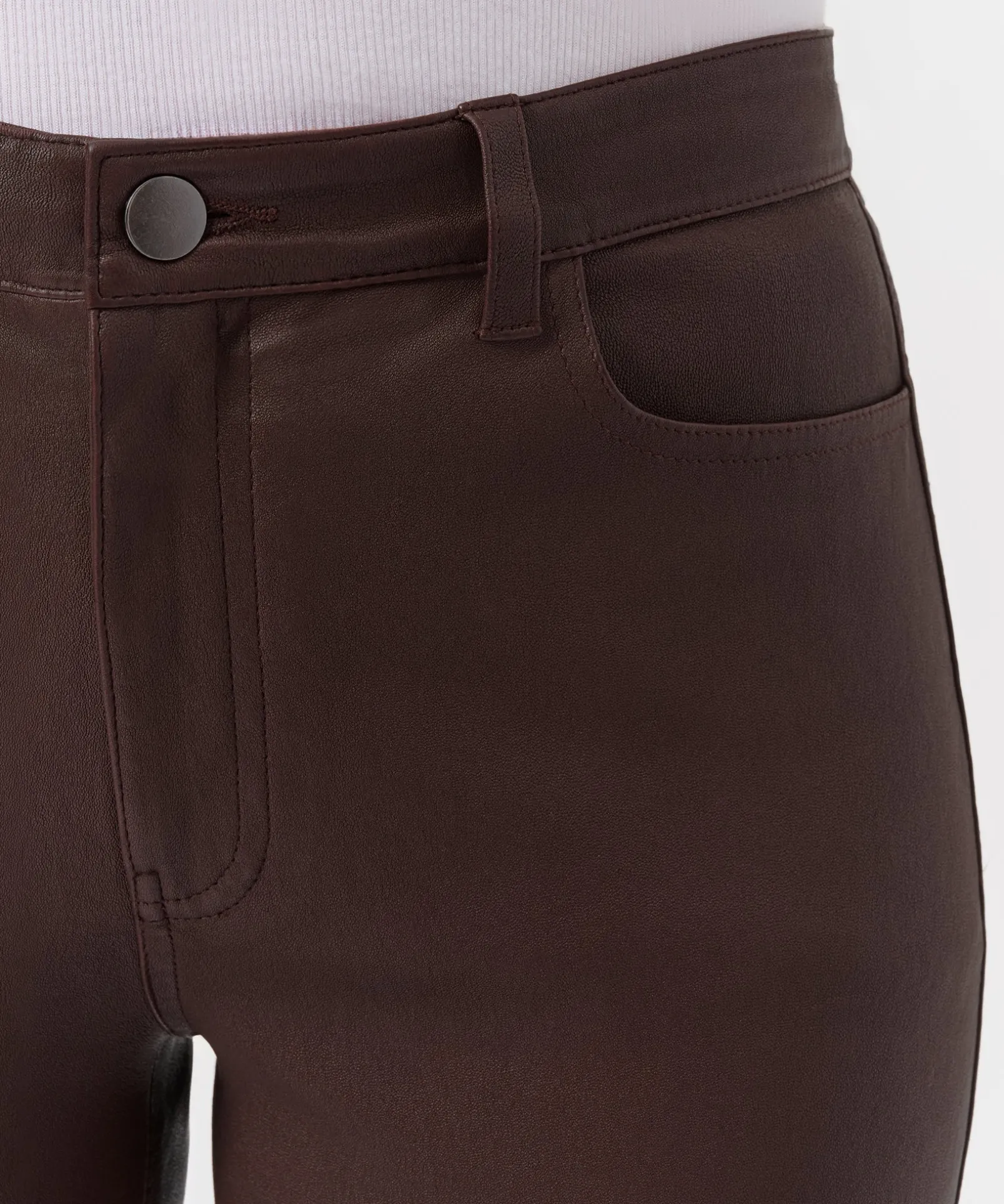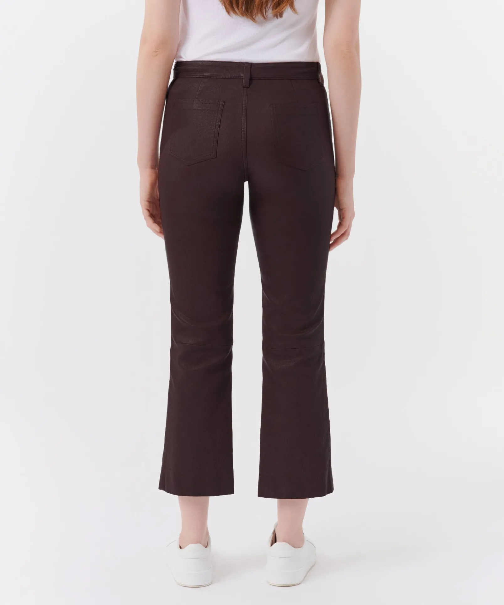 The Cropped Flare Pant is a comfortable style crafted from soft 100% lamb leather. They feature a hip-hugging, straight silhouette that opens up below the knees and stops just above the ankles.