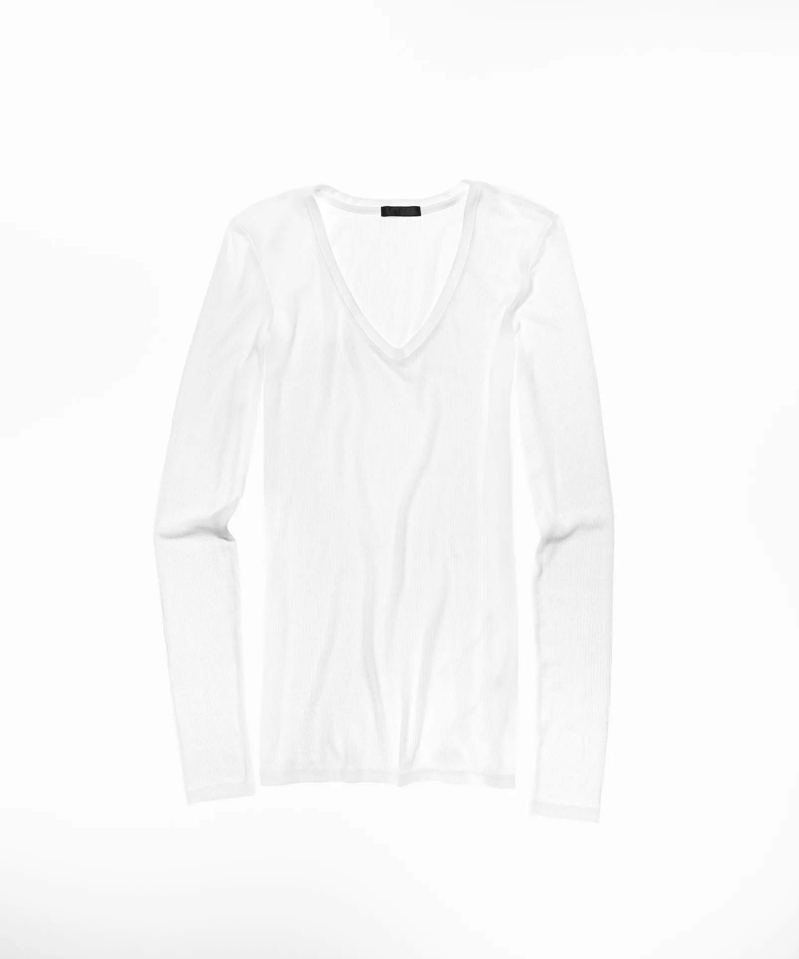 The Modal Rib Long Sleeve V-Neck Tee features a single-layer, featherweight construction with a meticulously measured v-neck. The Micro-Modal yarn, made in Peru on a machine used only by ATM, is inimitably soft. It is the ultimate everyday basic that molds to the body like a second skin.This piece was crafted from Tencel™, a Modal fiber derived from raw material wood. It is produced using a closed-loop spinning process in which chemicals and water are recycled at a recovery rate of 99%. Biodegradable and compostable, this fabric can ultimately be returned back to nature. Kind to the planet and to the body, it is soft, breathable and gentle on the skin.