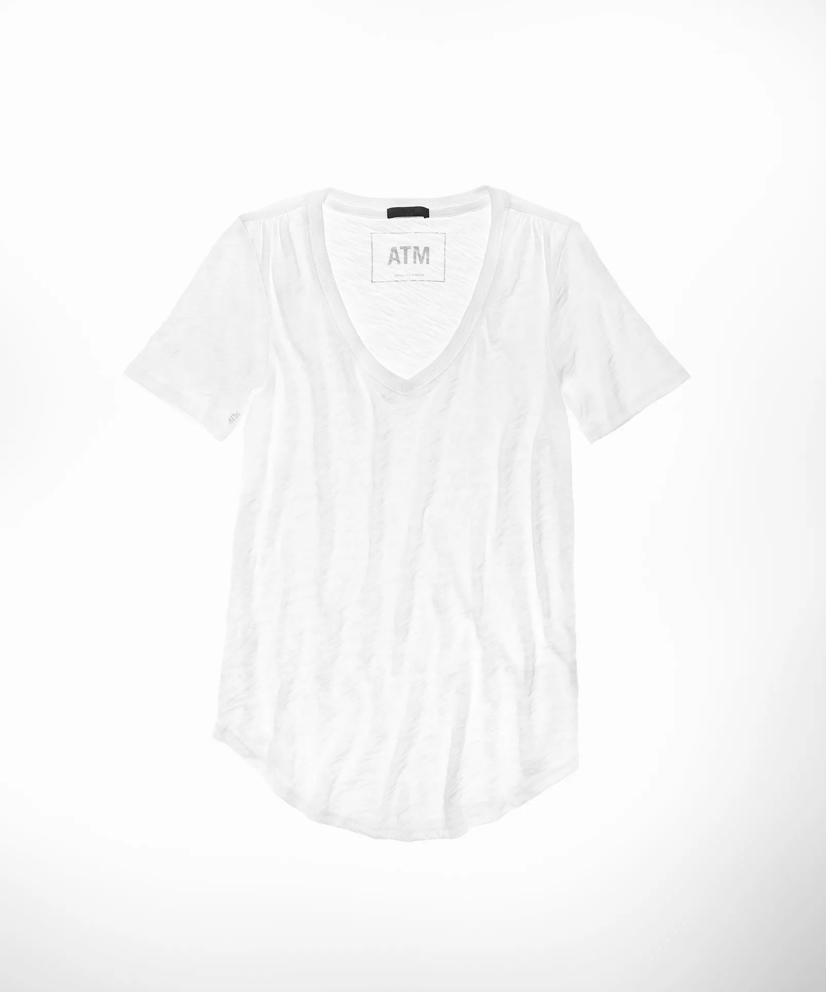 The Slub Jersey Classic V-Neck Tee gets its texture from the uneven yarns of our unique Peruvian Cotton. It features a relaxed v-neck, shirred shoulders and just the right amount of sheer. The loose weave of this heavier Cotton molds modestly to the body offering the perfect drape. Its long, flattering silhouette is meticulously measured–tapered at the bust with a shirttail that covers the butt without cling.