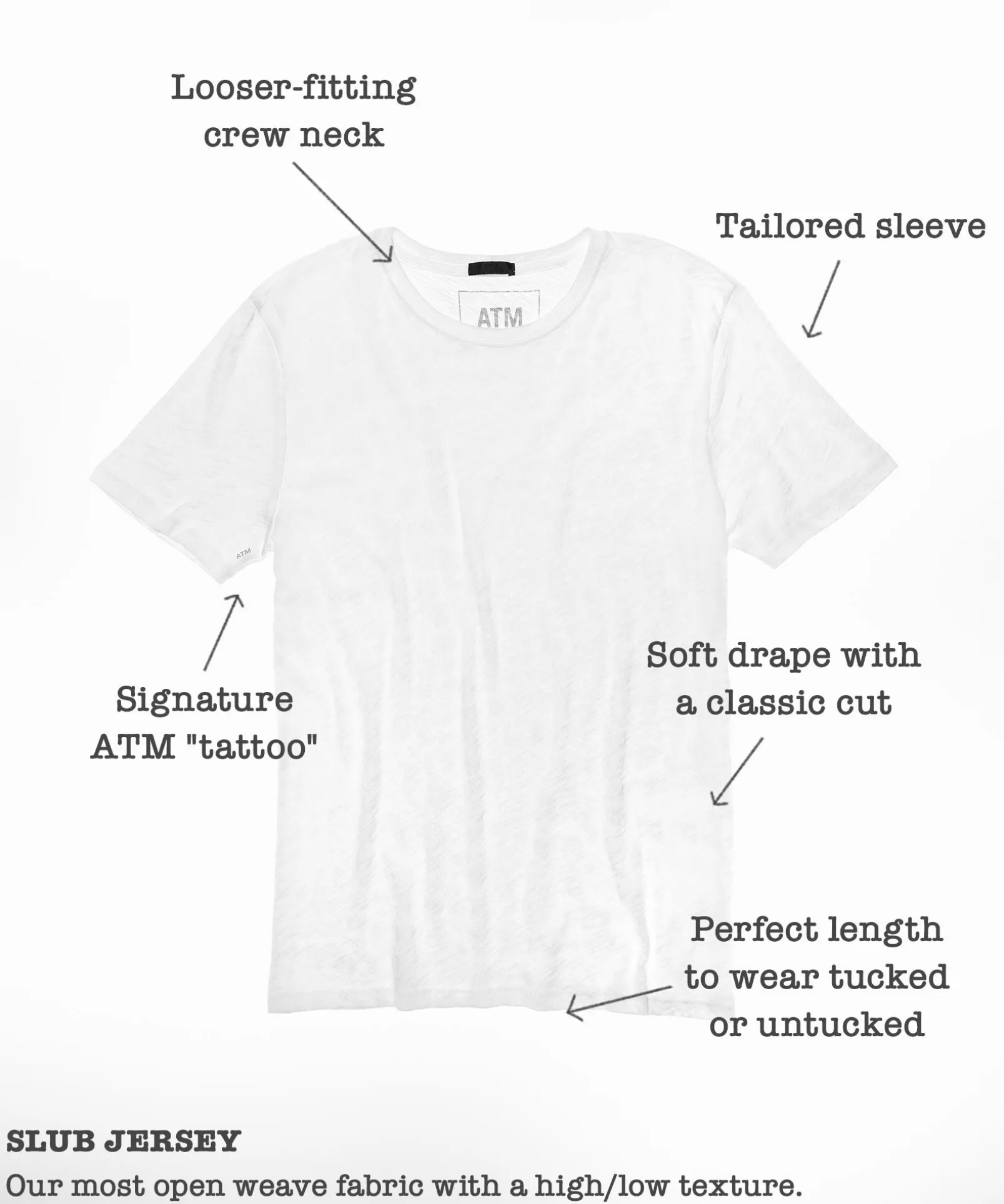The Slub Jersey Crew Neck Tee gets its texture from the uneven yarns of our unique Peruvian cotton. It features a relaxed crew neck silhouette, short sleeves and just the right amount of sheer. The loose weave of this heavier cotton molds modestly to the body offering the perfect drape.