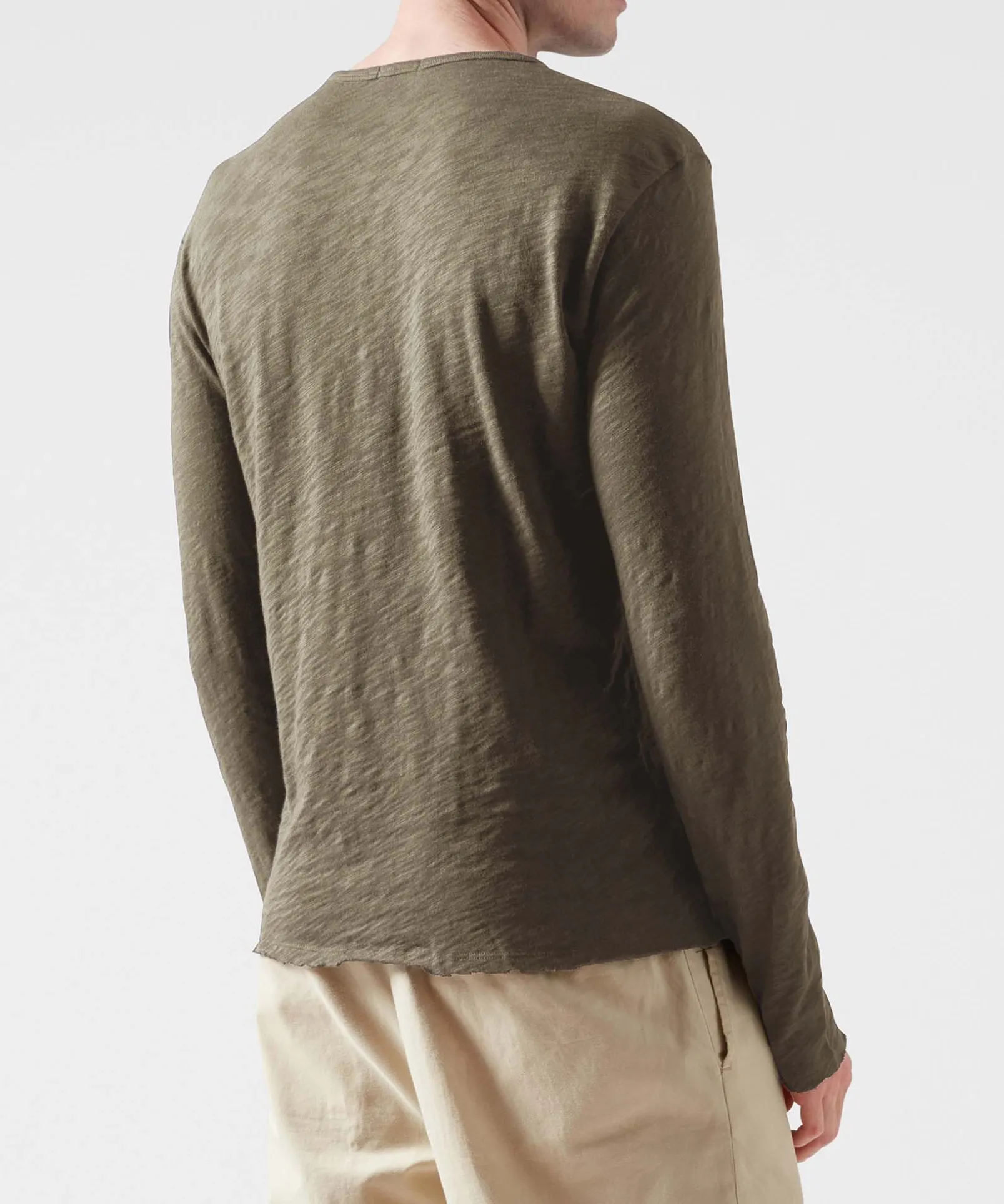 The Slub Jersey Destroyed Wash Henley gets its texture from the uneven yarns of our unique Peruvian Cotton. It features a refined neckline with a narrow placket for a slimming effect, and buttons dyed to match the exceptionally soft Peruvian Cotton composition. The modest drape, straight cut hem and meticulously measured neckline offer an elevated take on the classic silhouette.