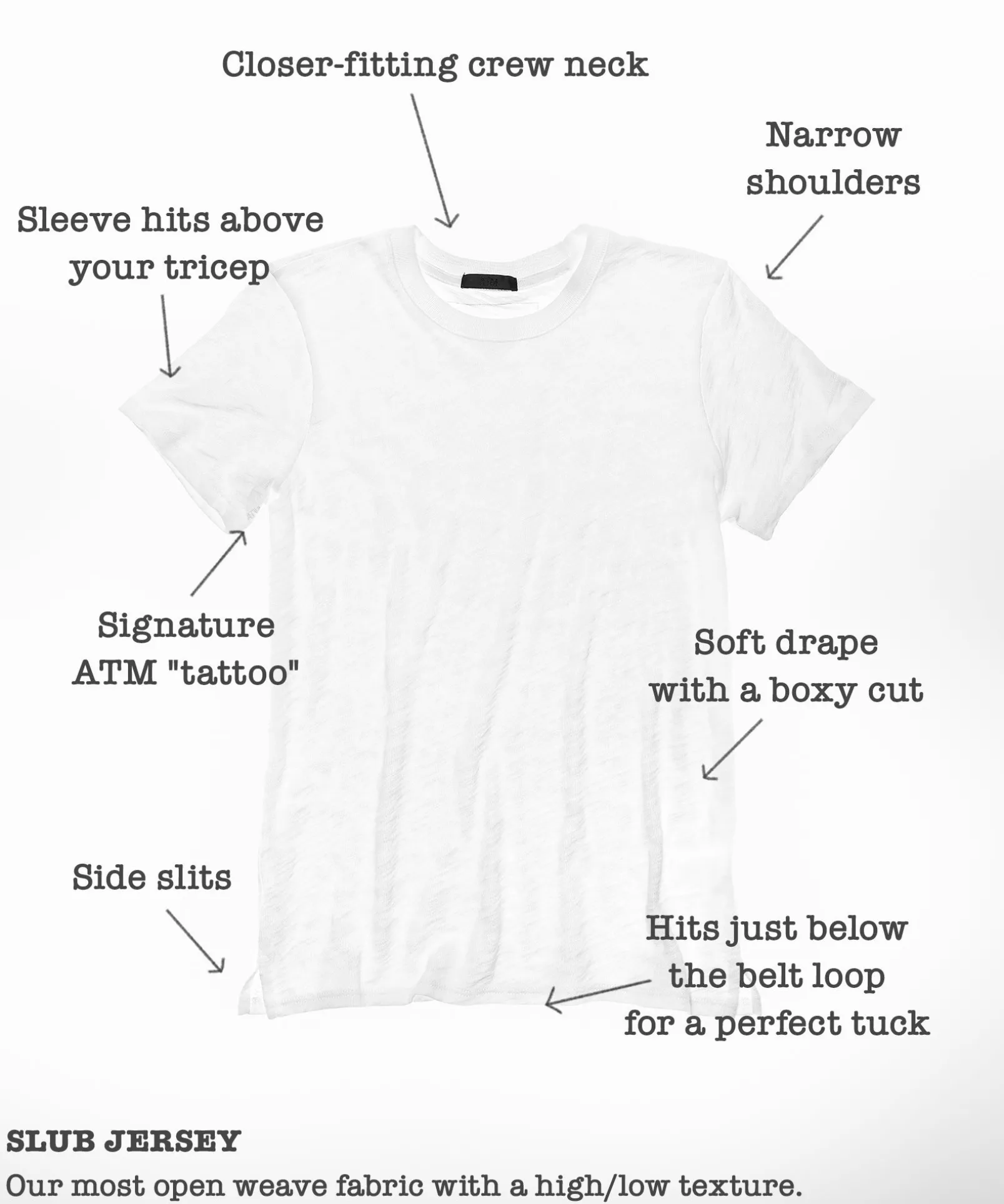 The Slub Jersey Schoolboy Crew Neck Tee gets its texture from the uneven yarns of our unique Peruvian Cotton. It features a relaxed crew neck silhouette and just the right amount of sheer. The loose weave of this heavier Cotton meets the slightly shrunken straight cuts of the Schoolboy silhouette.