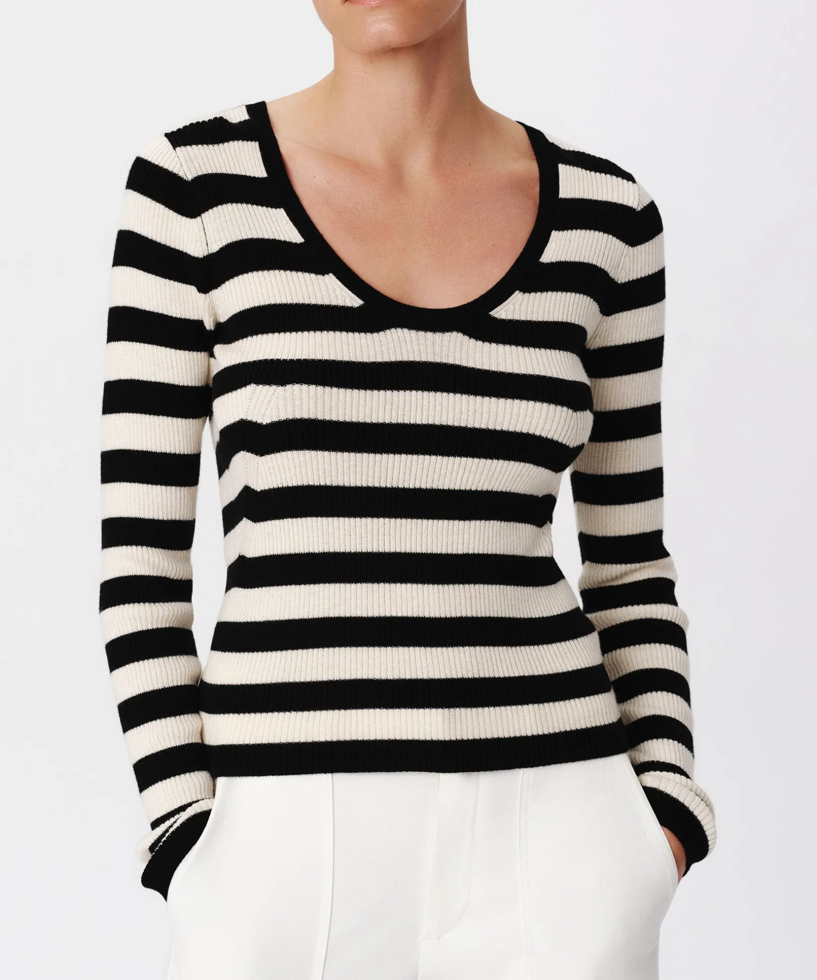 The Wool Blend Striped Long Sleeve Sweater is a super soft style crafted from a merino wool cotton blend. It features a scoop v neckline with ribbing on the body and sleeves.
